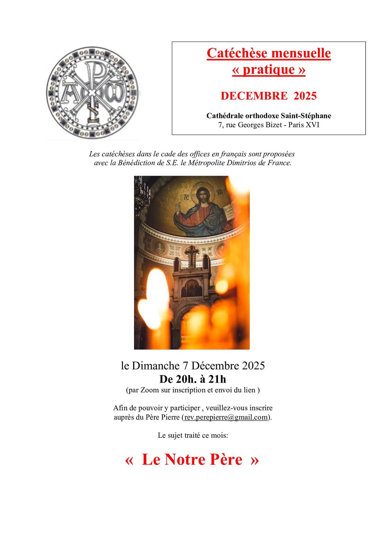 Les catéchèses sont organisées en visio-conférence les premiers et derniers dimanches de chaque mois. Leur annonce est faite dans le calendrier. Afin de pouvoir y participer , veuillez-vous inscrire auprès du Père Pierre.